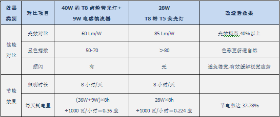 将原有T8卤粉灯管更换使用28W的T8转T5荧光灯(28W功率T5灯管的照度等同于36-40W功率T8灯管。),可节约36%的能耗,标准的三基色灯管,寿命高达10000小时(普通T8卤粉管为3000小时),照度、寿命、稳定性都以远远超越了原来的T8荧光灯。最为关注的还是节能,28W与36W+9W(注:配用T8管的电感镇流器功耗)的比例显而易见,工厂既可以降低消耗,节省成本,还可改善照明环境,提高工作效率。