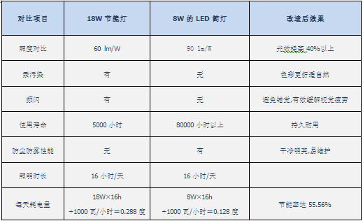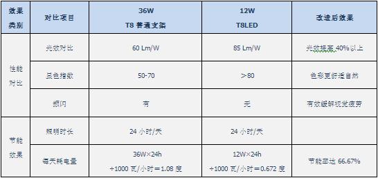 本着客户“节能优先、降低成本”的要求,杭州香溢费斯特工程师建议采用12W的LED节能灯,可节约40%的能耗,使用标准三基色灯管,寿命高达10000小时(普通T8卤粉管为3000小时)。照度、寿命、稳定性都以远远超越了原来的T8荧光灯。最为关注的还是节能,12W与36W的比例显而易见,客户受益,国家节约能耗。