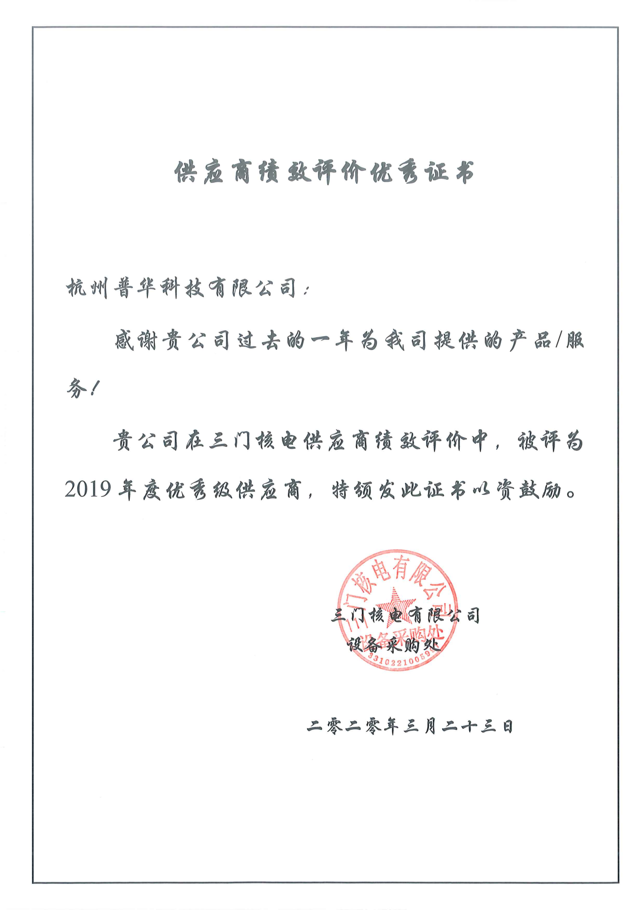 【杭州普华科技有限公司】祝贺我司在三门核电绩效评价中,被评为2019年度优秀级供应商